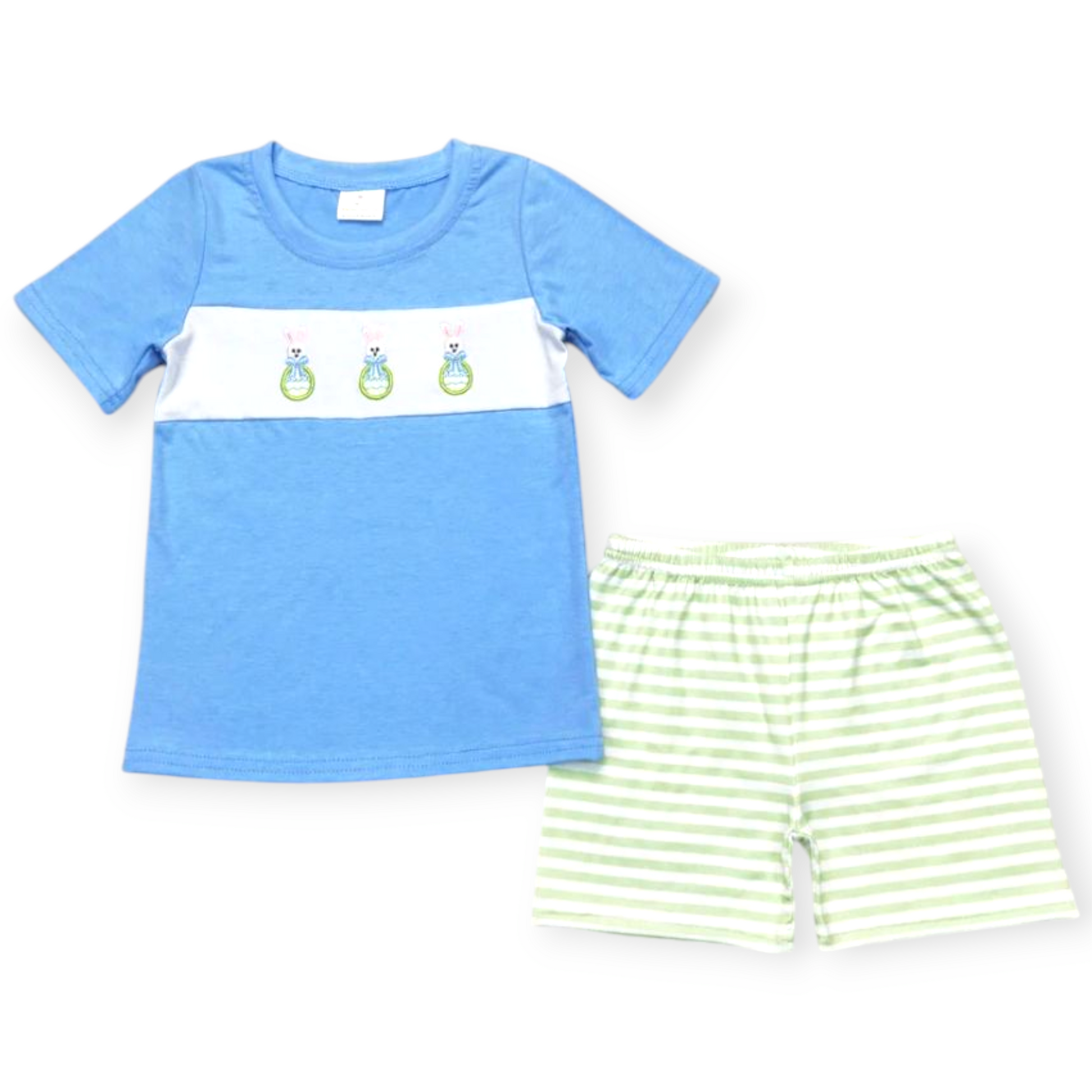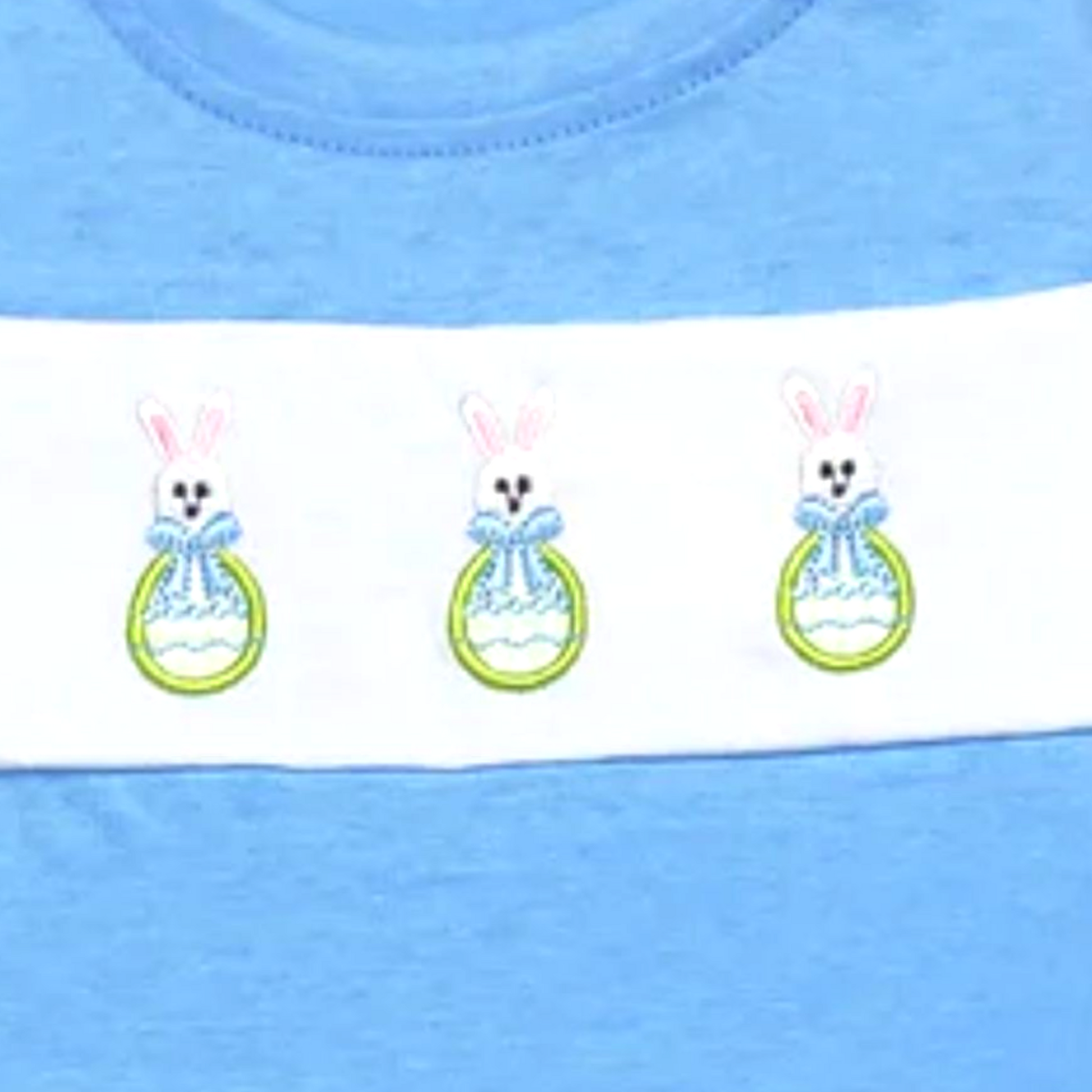 This adorable 3 bunny short set is perfect for Easter pictures! Made with embroidered cotton and featuring 3 bunnies popping out of Easter eggs, it's both comfortable and cute. Paired with elastic waist shorts, this set is a must-have for any little one. Check out the sister match for even more adorable Easter photo opportunities!
