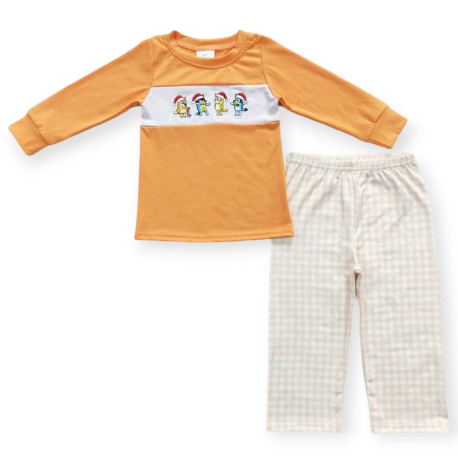 Add some festive fun to your little guy's wardrobe with our boy cotton embroidered bluey Christmas top and pant set. it's not only comfortable but also sure to bring a smile to his face. it's perfect for holiday gatherings.