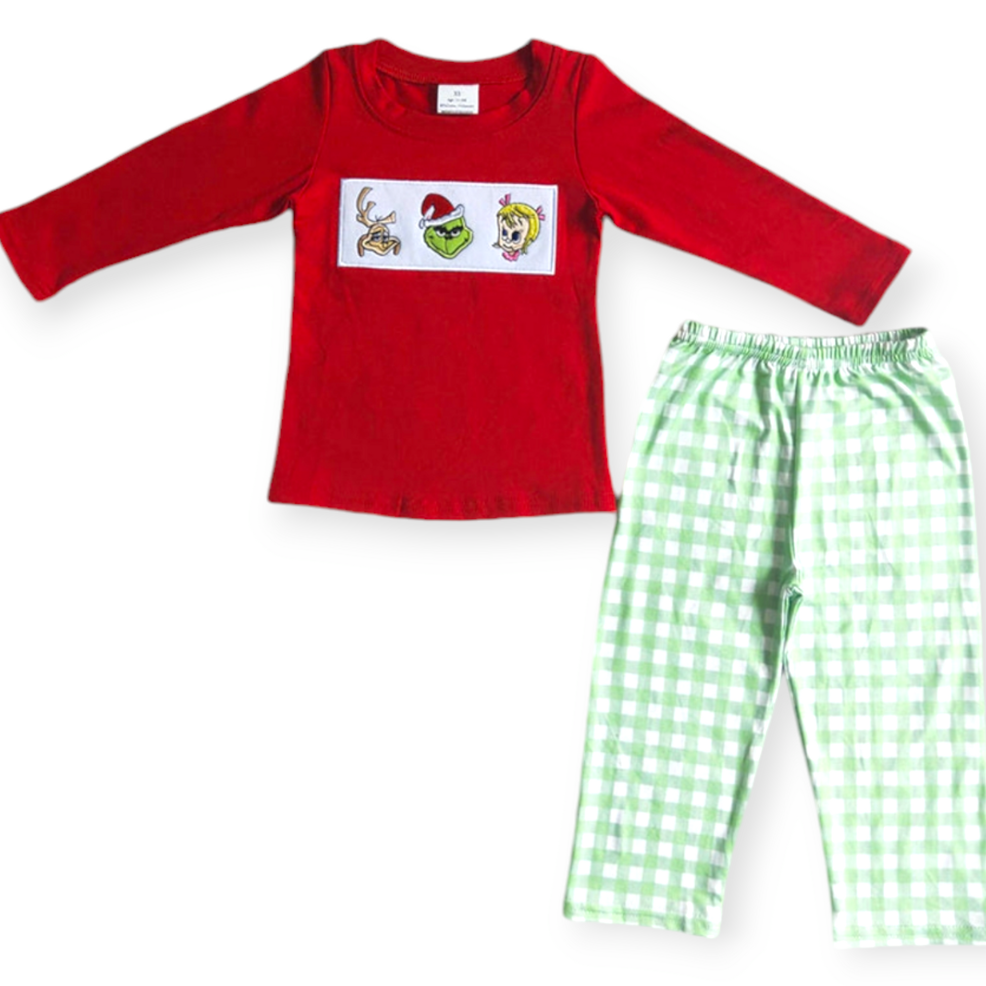 cotton shirt with embroidered grinch shirt, paired with matching pants.