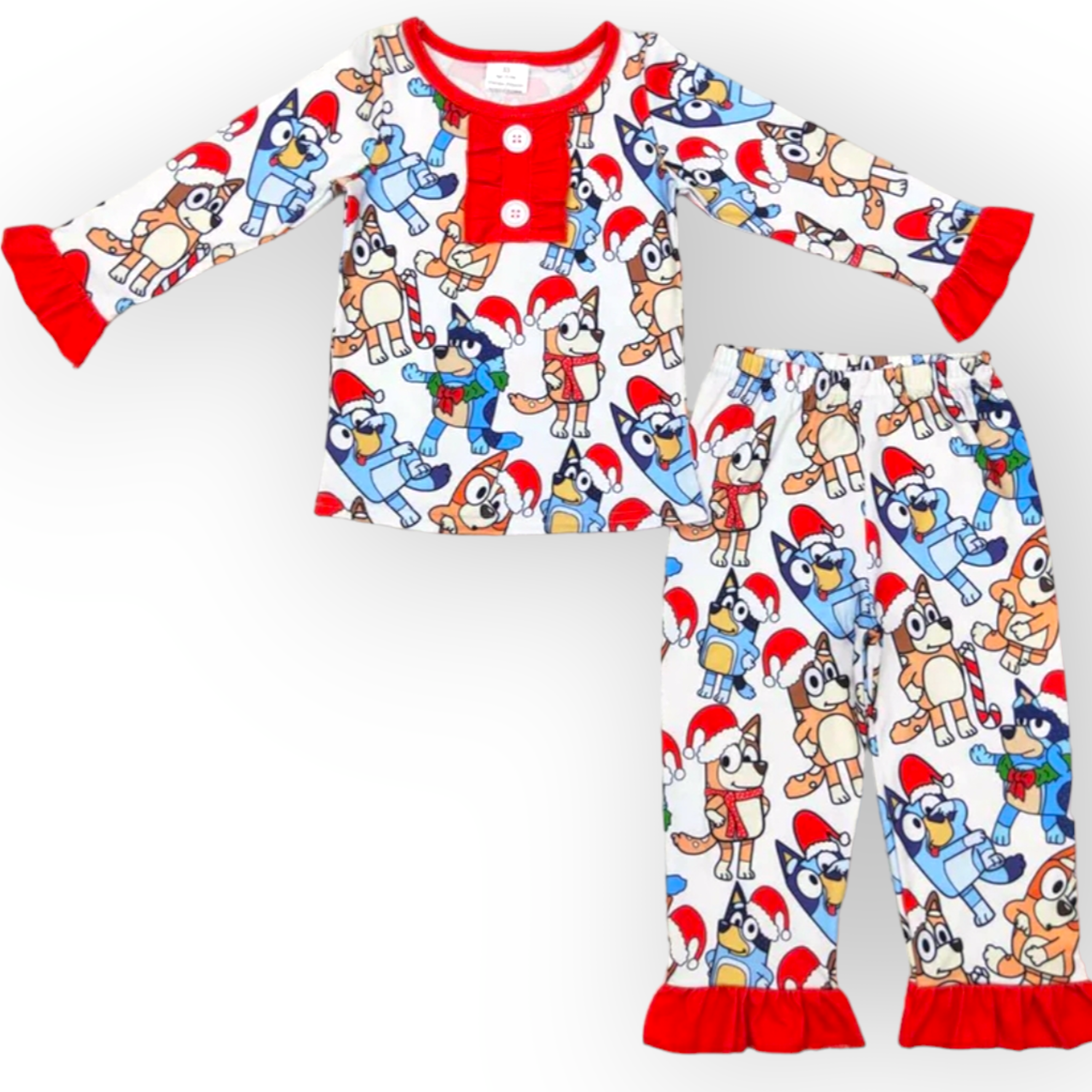 adorable holiday themed bluey pajamas in an ultra soft milk silk fabric.
