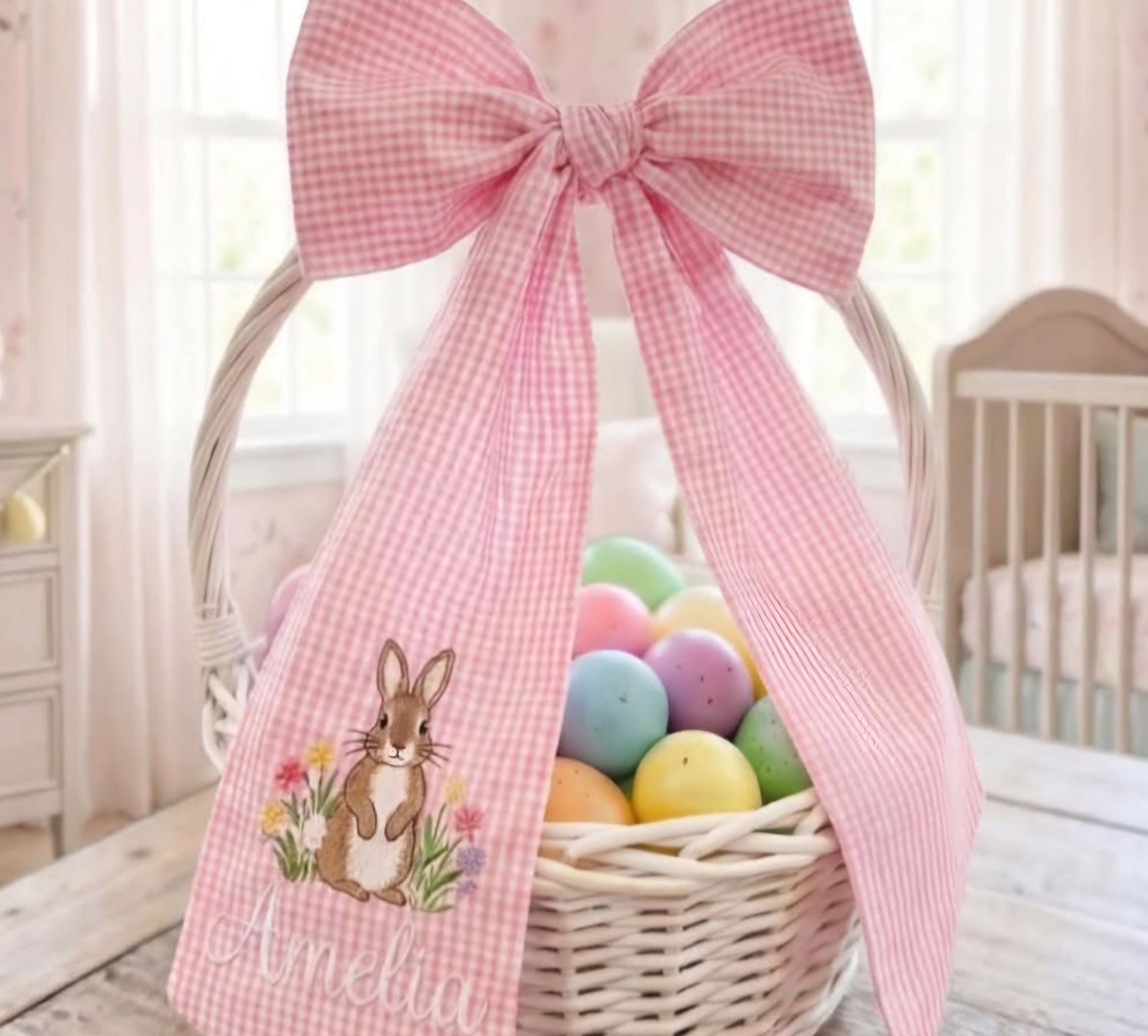 Your childs Easter basket will be so precious!! or your front door wreath—with our Heirloom Sash! Choose your fave color. We will embroider your child’s name and design on the sash. It’s like a fashionable accessory for your décor that you can use year after year—heirloom quality keepsake