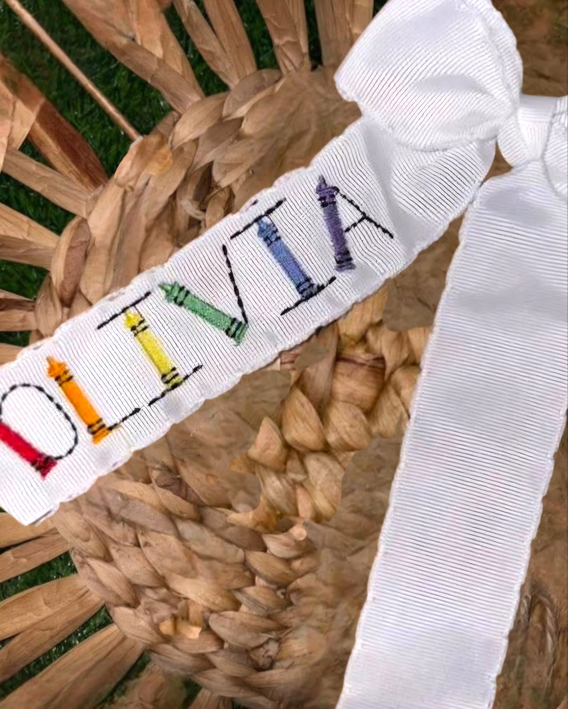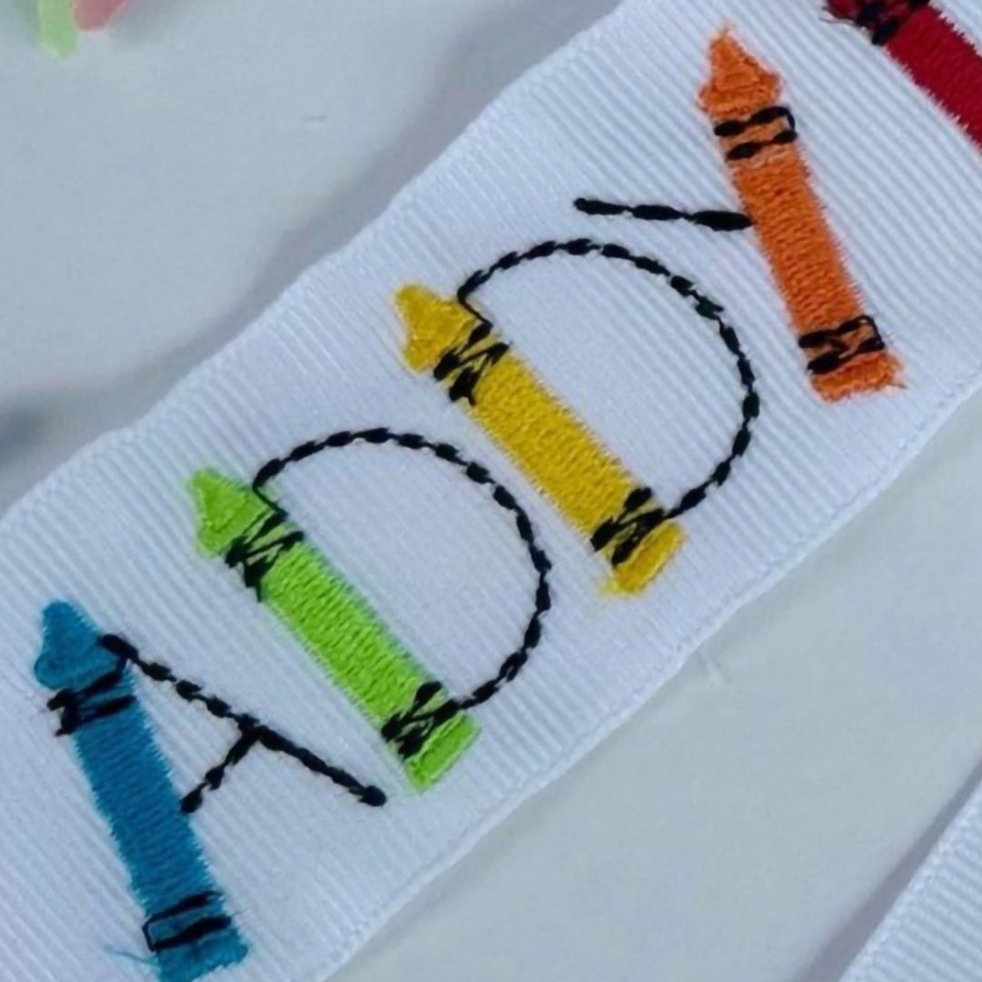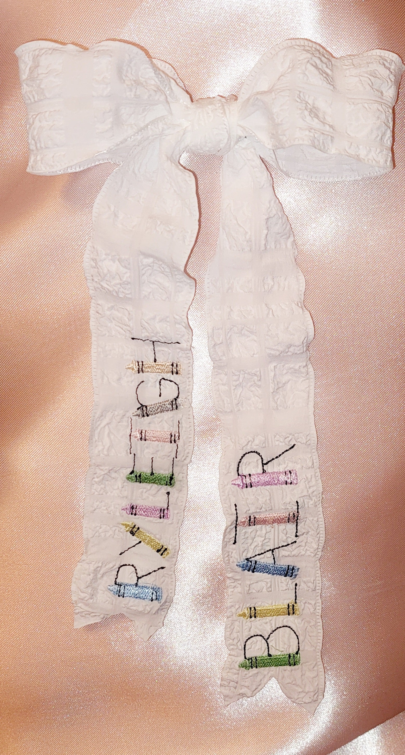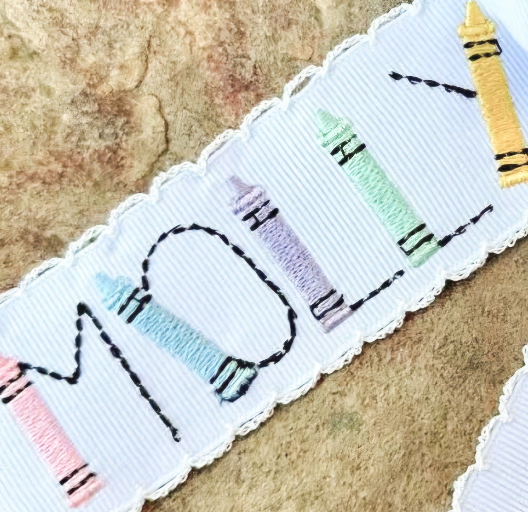 Add a whimsical touch with the Moonstitch School hairbow Ribbon, featuring charming embroidered pencil letter motif in cheerful pastel or bright primary colors. Perfect for back to school. or gift giving.