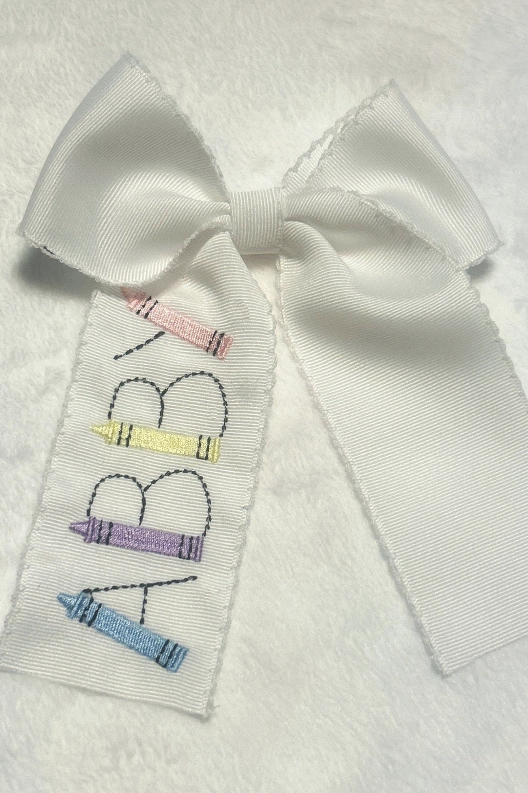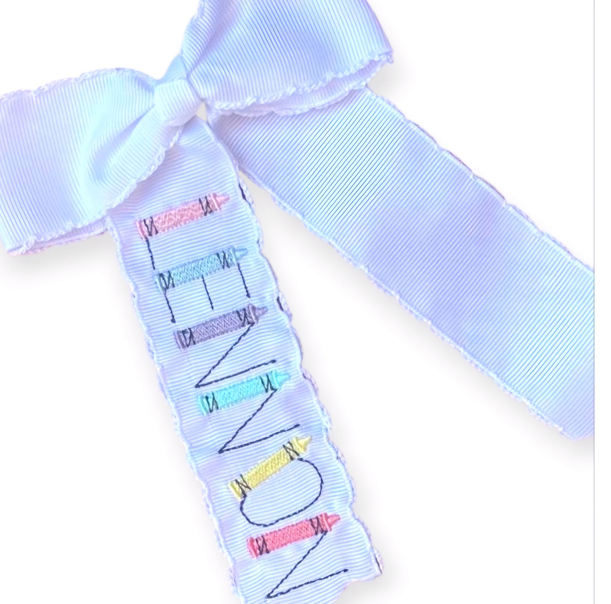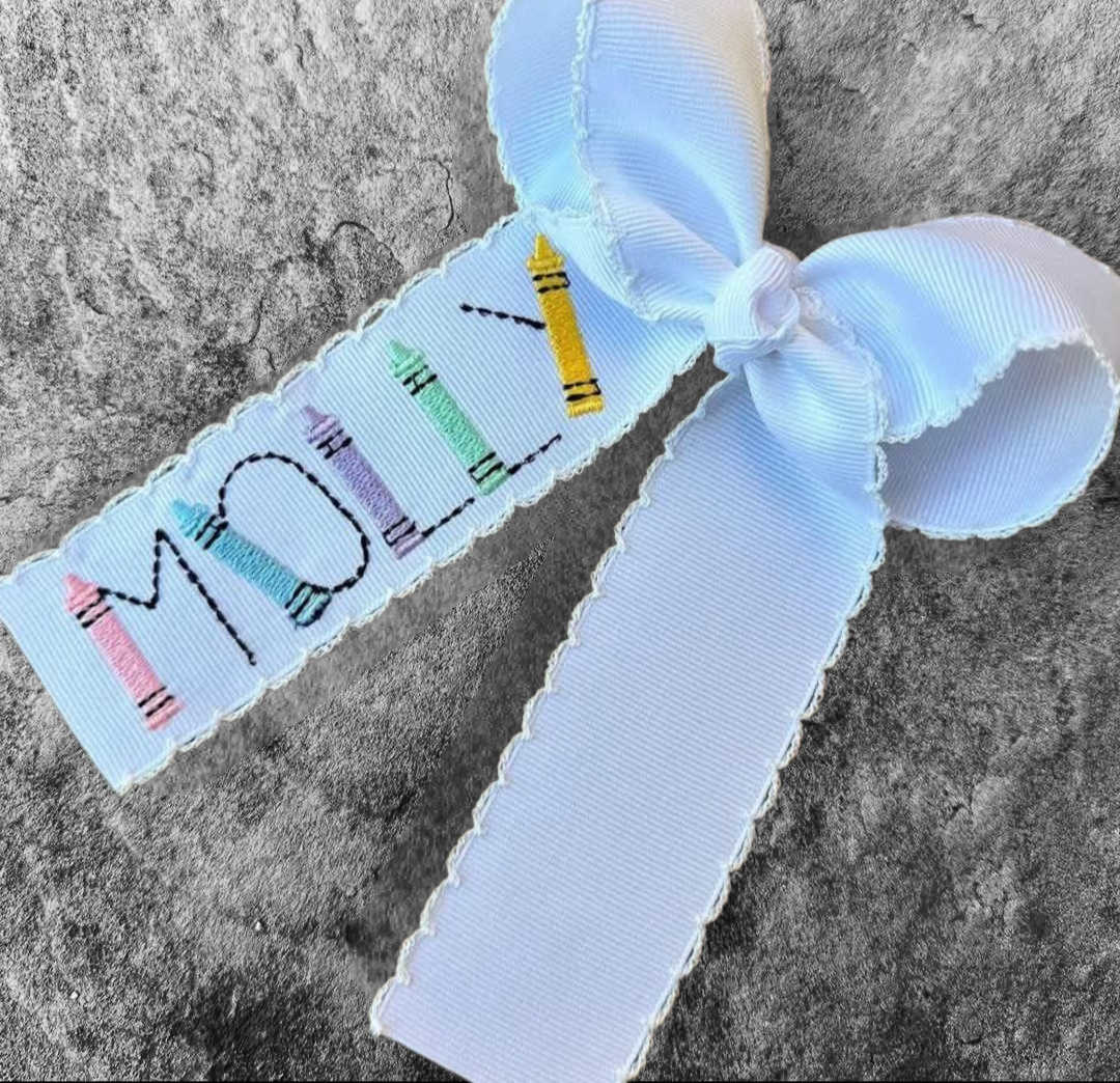 Add a whimsical touch with the Moonstitch School hairbow Ribbon, featuring charming embroidered pencil letter motif in cheerful pastel or bright primary colors. Perfect for back to school. or gift giving.
