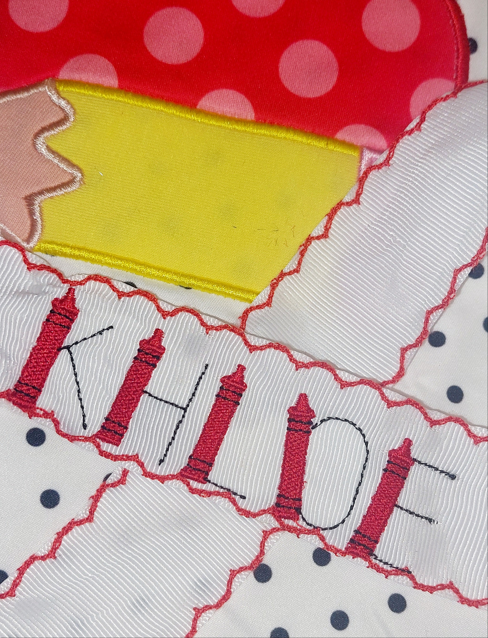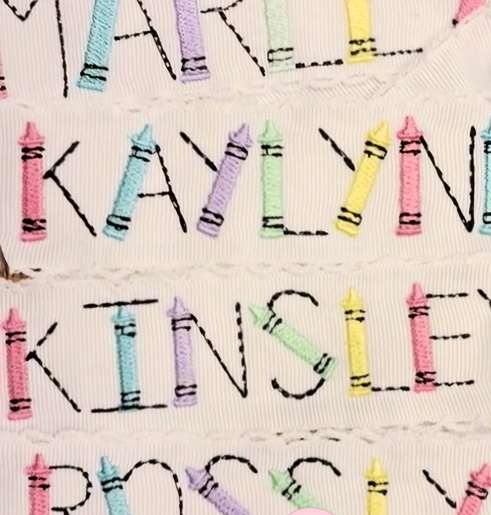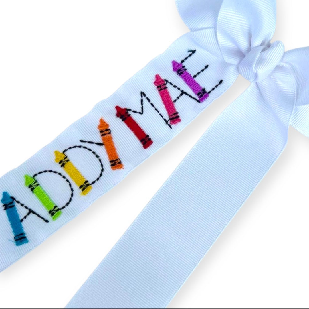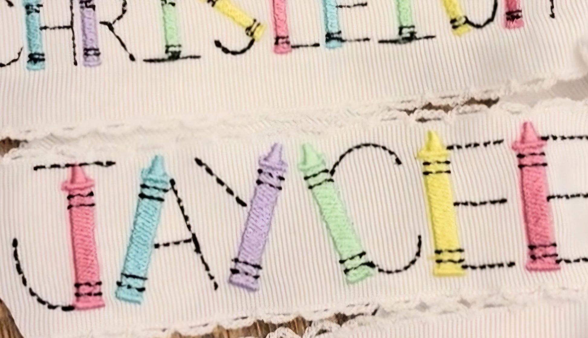 Add a whimsical touch with the Moonstitch School hairbow Ribbon, featuring charming embroidered pencil letter motif in cheerful pastel or bright primary colors. Perfect for back to school. or gift giving.