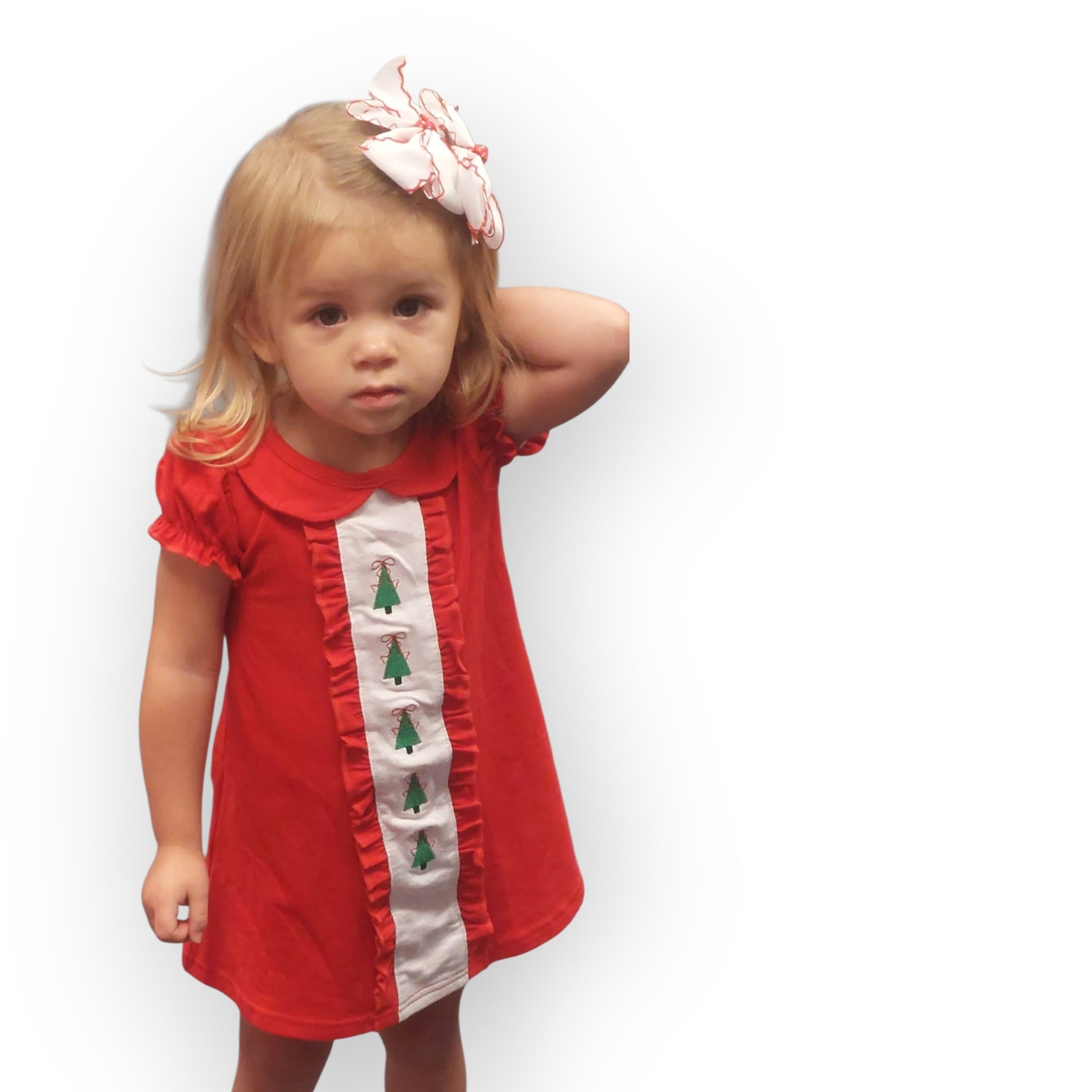 Be the belle of the holiday party in our Oh Christmas tree dress. Made with red cotton, this dress features a stylish collar and adorable ruffle trim. The embroidered trees, topped with bows, add a touch of sweet charm. Perfect for a simple, yet festive look.